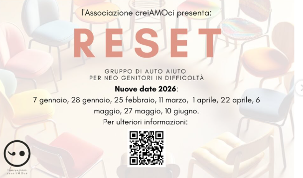 L'associazione CreiAMOci condivide l'invito a partecipare a RESET gruppo di auto-aiuto dedicato ai neo genitori in difficoltà, di seguito il calendario degli incontri 2026: